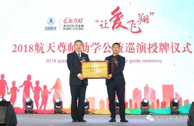 为感谢广大航天生物用户对航天尊师助学公益活动的大力关心和支持,巡演现场,主办单位为热心尊师助学的航天用户颁发了2018“让爱飞翔”航天尊师助学爱心大使奖牌。